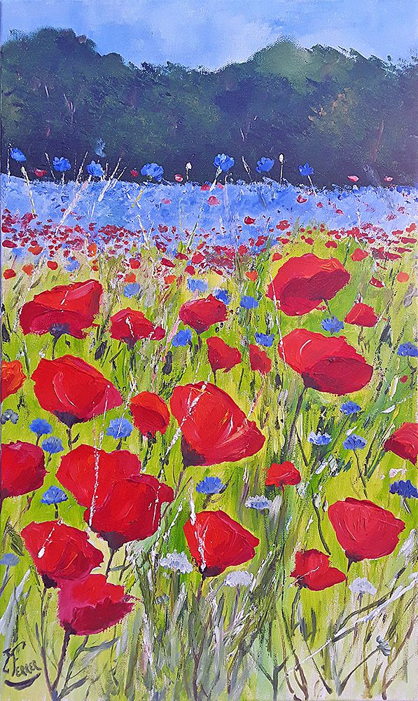Peinture à l'huile au couteau: Coquelicots et bleuets